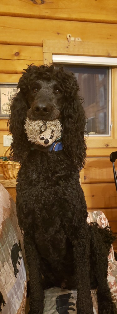 Big shaggy dog with toy at Jamie and Simon's